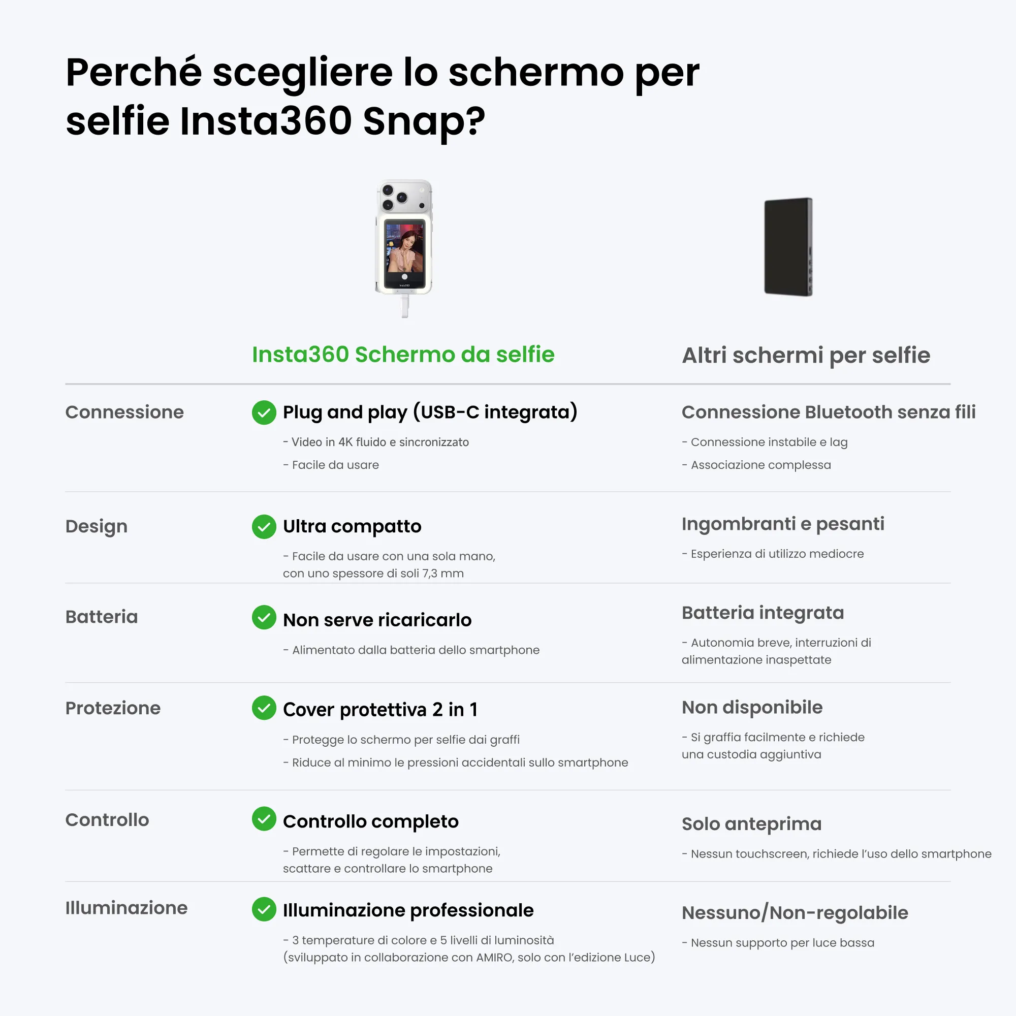 Collegati con cavo USB-C per un segnale stabile meglio di ogni wireless. Anteprima in tempo reale per selfie e vlog ad alta risoluzione.