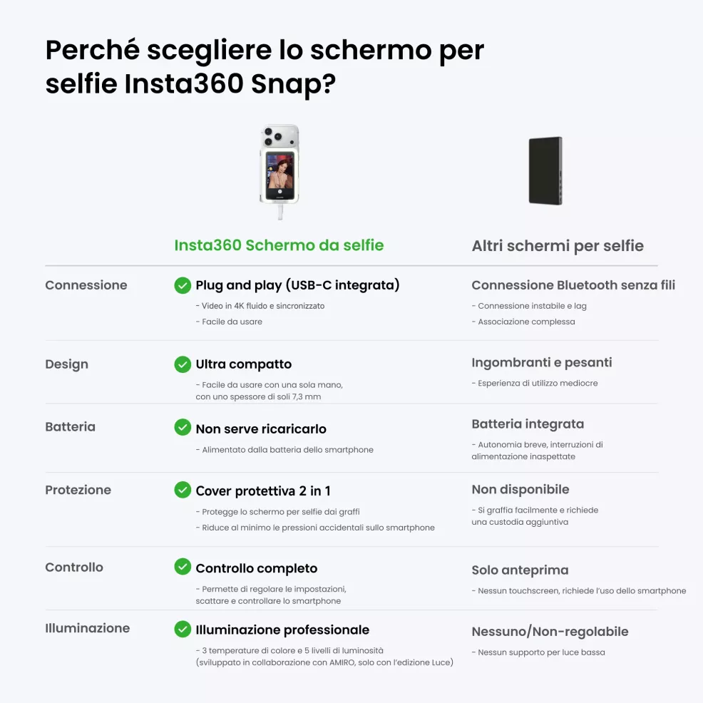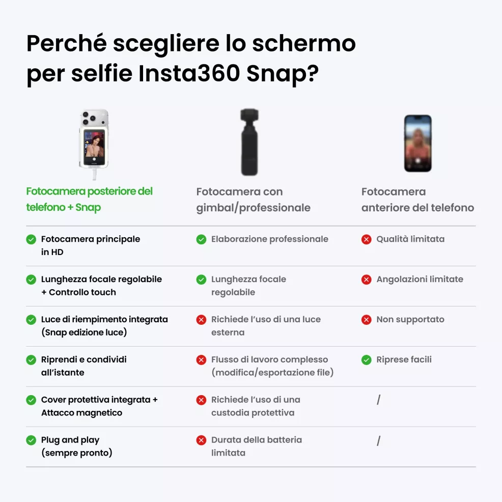 Niente più "riprese alla cieca". Con Insta360 Snap catturi tutto ciò che vedi dalla potente fotocamera posteriore del telefono.