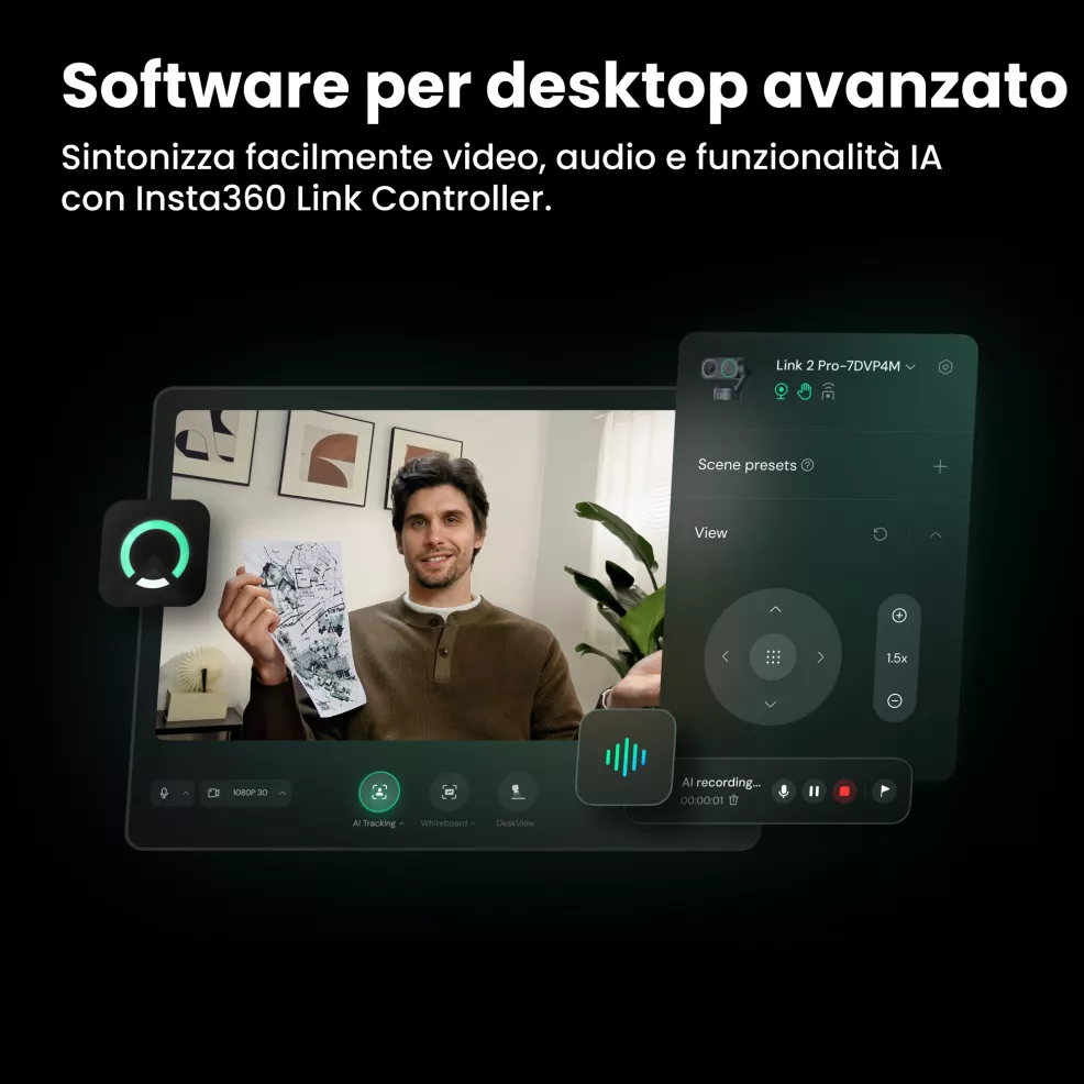 *La Insta360 Videocamera Virtuale verrà installata automaticamente con Link Controller. La Videocamera Virtuale supporta le Modalità Whiteboard Intelligente, Effetto Sfocato Naturale, Sfocatura e Sostituzione dello sfondo e la Modalità Trucco. La Videocamera Virtuale non supporta le risoluzioni 50fps o 60fps; La Modalità Trucco non supporta la risoluzione in 4K.Video